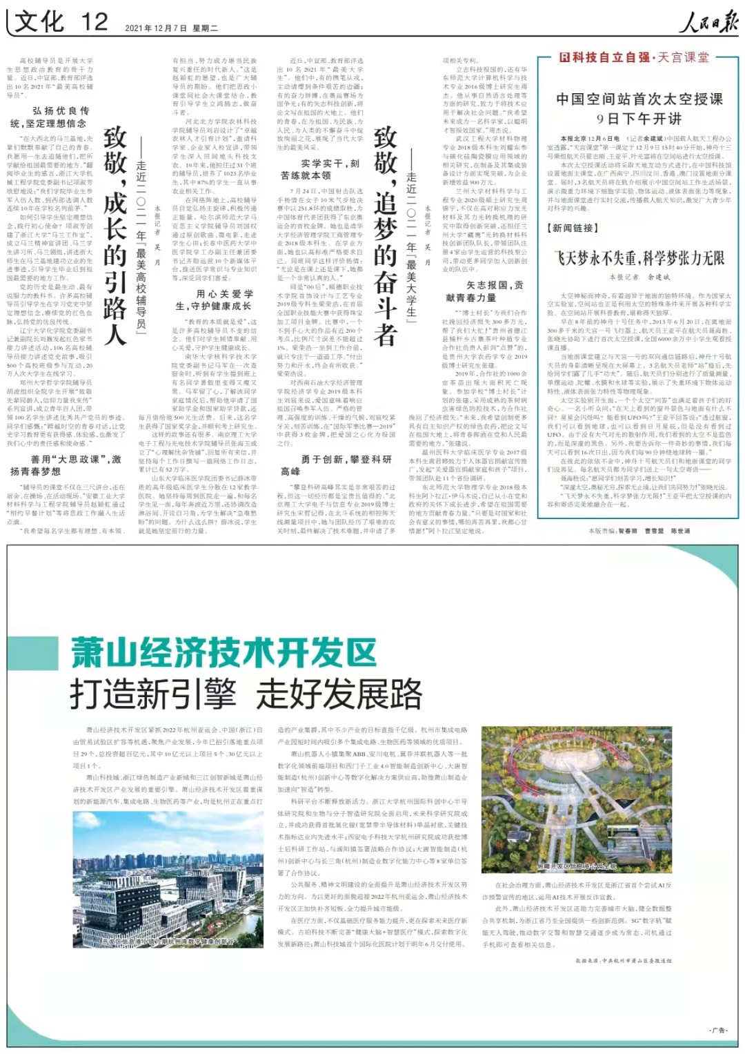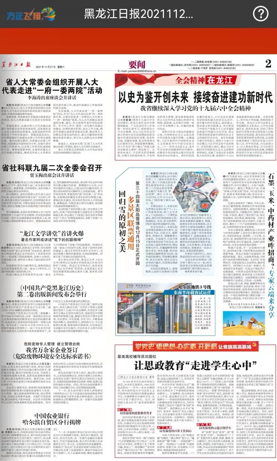 11月27日,黑龙江日报第2版“让党旗高高飘扬”专栏长文介绍刘国权先进事迹。文章以《最美高校辅导员刘国权:让思政教育“走近学生心中”》为题,详细介绍了其向“上”着眼,以有温度的思想教育为党育人、为国育才,向“下”扎根,以有温度的日常工作培根铸魂、启智润心,向“内”发力,以有温度的示范引领励学生志、奋青春力的育人事迹。