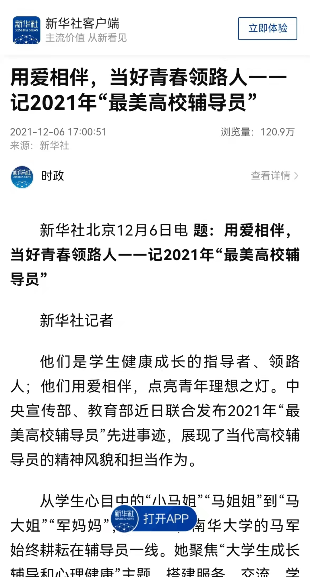 12月7日,中央广播电视总台联合主办《闪亮的名字——2021最美高校辅导员/最美大学生》发布仪式,中央广播电视总台科教频道(CCTV-10)首播。12月8日,中央广播电视总台综合频道(CCTV-1)重播发布仪式。学习强国、央视网、央视频等对发布仪式进行同步直播。
