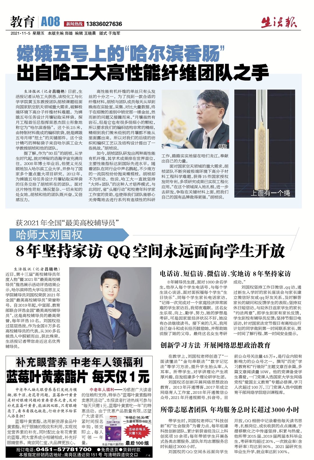 11月5日《生活报》教育版以《哈师大刘国权:8年坚持家访 QQ空间永远面向学生开放》为题,介绍其坚持家校合力育人、创新开展网络思想政治教育、以志愿服务推动实践育人的工作经验做法。
