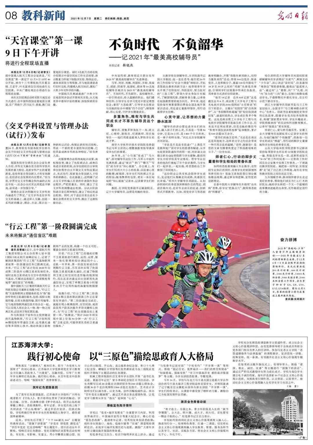 12月7日,光明日报第8版以《不负时代 不负韶华——记2021年“最美高校辅导员”》为题宣传报道刘国权先进事迹。文章指出:哈尔滨师范大学辅导员刘国权探索破解辅导员学讲理论“欠底气”、真情互动“少方法”、谈心谈话“没时间”、信息通知“难到位”等困惑难题,提炼出“温度育人法”:通过向“上”着眼、向“下”扎根、向“内”发力的“三向”着力,在细小细微处感动学生,于潜移默化中感化学生,在言行示范下感召学生。