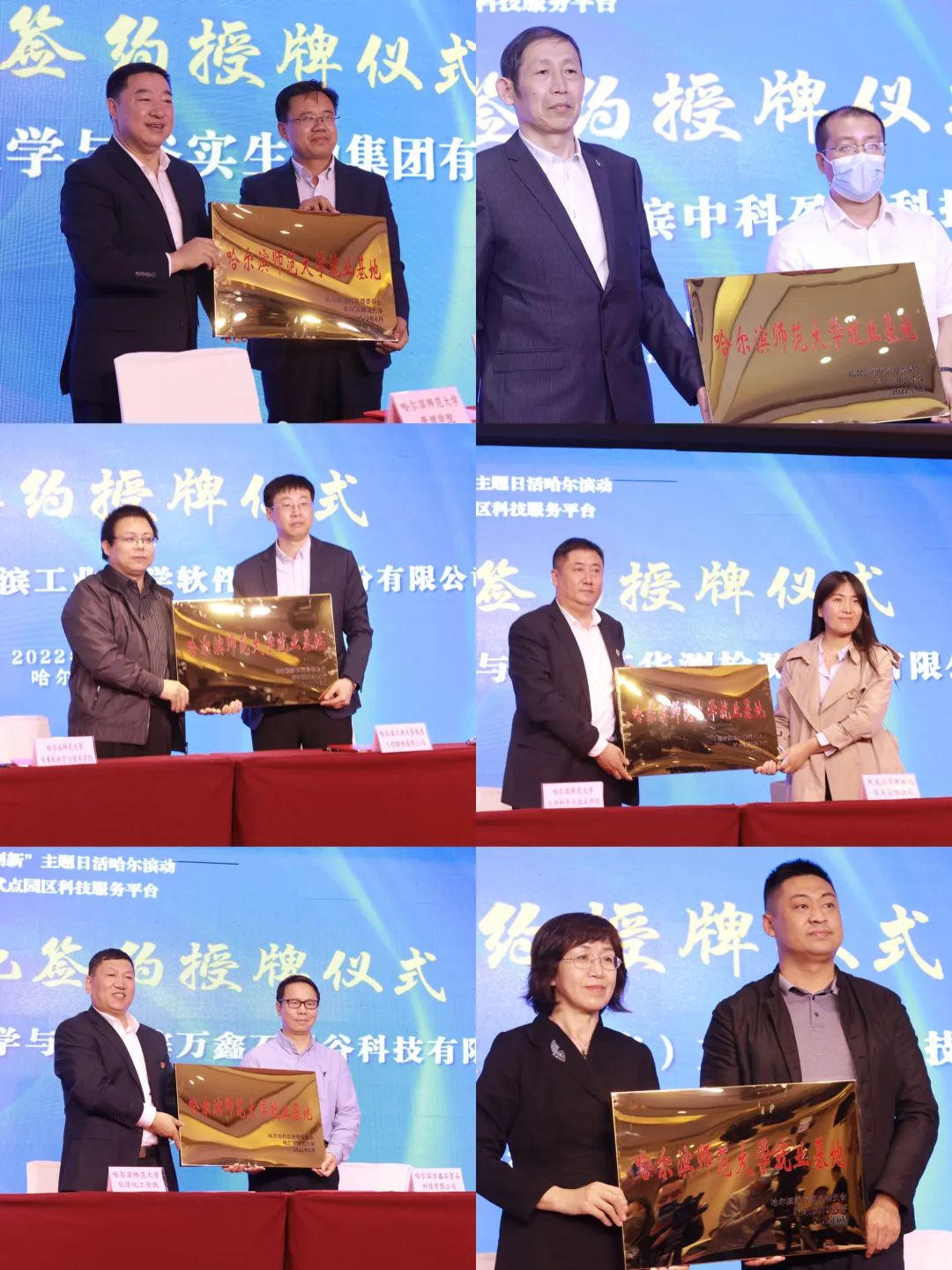 签约仪式上,我校化学化工学院、美术学院、物理与电子工程学院、管理学院、生命科学与技术学院、计算机科学与信息工程学院相关同志分别与哈尔滨万鑫石墨谷科技有限公司、朝喜(哈尔滨)文创动漫科技有限公司、哈尔滨中科盈江科技有限公司、谷实生物集团股份有限公司、黑龙江省华测检测技术有限公司、哈尔滨工业大学软件工程股份有限公司签订就业合作协议并授牌。