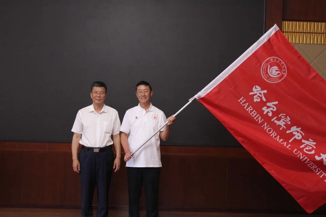 孙立军为代表团授旗,并作动员讲话。他指出,省学运会是我省水平最高、规模最大、项目最多、竞争最激烈的学生体育盛会,是全省各地各校学生体育综合实力的一次大比拼,也是各地各校学生精神风貌的集中展示,更是对我校参赛运动员长期刻苦训练成果的大检验。孙立军向全体运动员、教练员提出三点希望,一是希望全体运动员、教练员切实增强使命感、责任感和荣誉感。要坚定信心、无惧挑战,全力以赴完成各项比赛任务,赛出风格、赛出水平,展现出哈师大人奋力建设“国内一流师范大学”的精气神,努力夺取运动成绩和精神文明的双丰收。二是希望全体运动员、教练员大力弘扬团结奋进拼搏精神。要切实增强凝聚力和战斗力,做到“有分必争,有牌必夺”,以顽强的意志品质、优异的体能技能、良好的心理素质、昂扬的竞赛斗志,竭尽全力争金夺银,努力为学校争光添彩。三是希望全体运动员、教练员严格遵守赛场纪律和防疫要求。要时刻把生命安全和身体健康放在第一位,提高安全防范意识,做好个人防护,服从赛场指挥,安全文明参赛,尊重裁判、尊重对手,更好地展示哈师大运动员的青春风采和精神风貌。