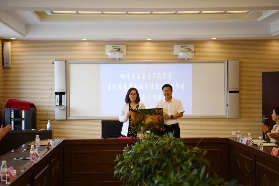 座谈会上,我校与绥化市教育局互授“哈尔滨师范大学就业基地”“绥化市驻哈尔滨师范大学人才工作站”牌,双方签署就业合作协议。