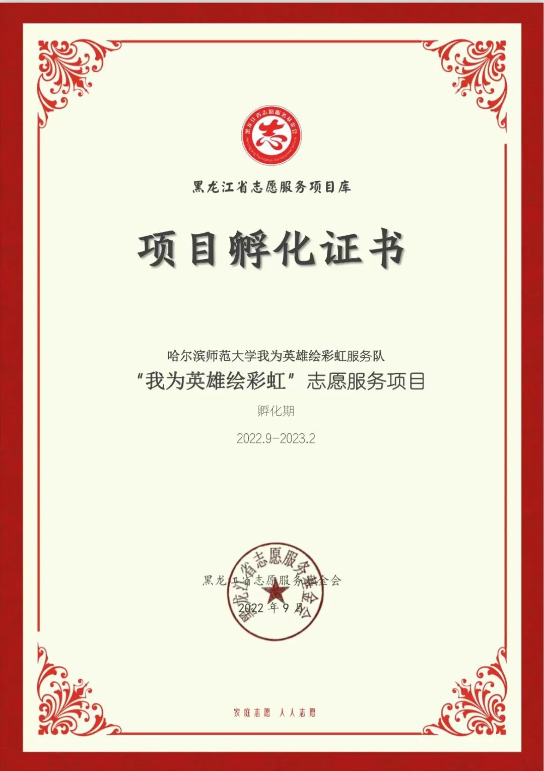 黑龙江省首届新时代文明实践志愿服务项目大赛是由省文明办主办、省志愿服务基金会承办的全省顶级志愿服务项目大赛,大赛从开赛到决赛历时4个多月,从200余个申报项目中遴选出100个优秀志愿服务项目。共评选出金奖项目5个、银奖项目10个、铜奖项目15个、创意奖项目30个、优秀奖项目40个,其中我校美术学院《“我为英雄绘彩虹”志愿服务项目》在省委教育工委报送的10个重点项目中脱颖而出,最终获得银奖,成为省委教育工委报送项目中的最高奖项。