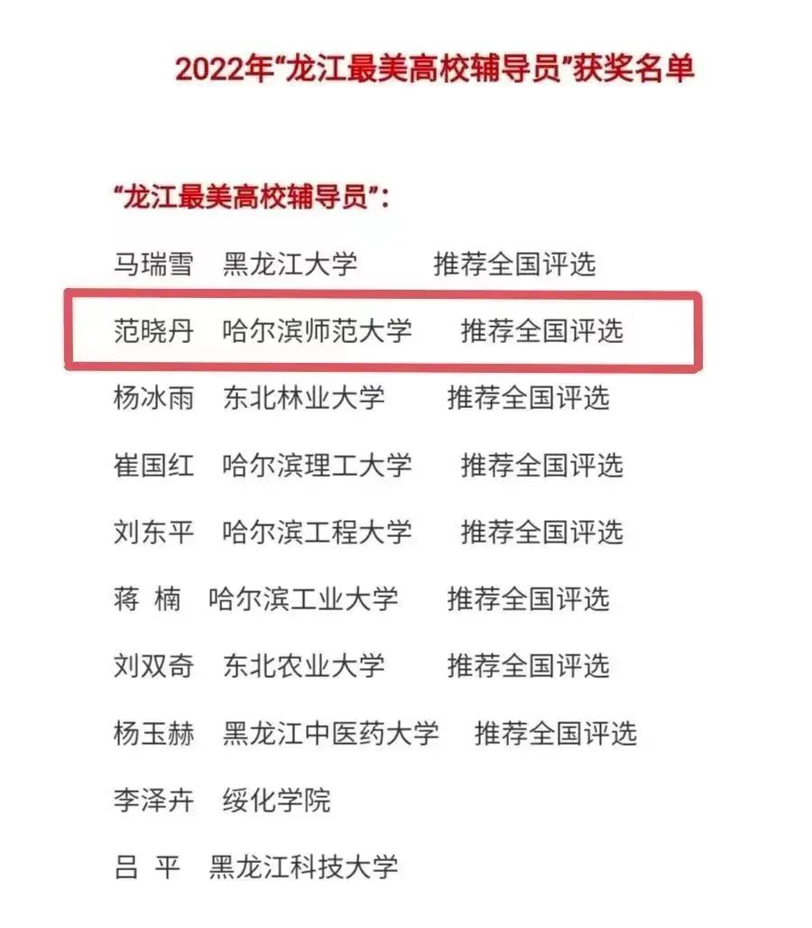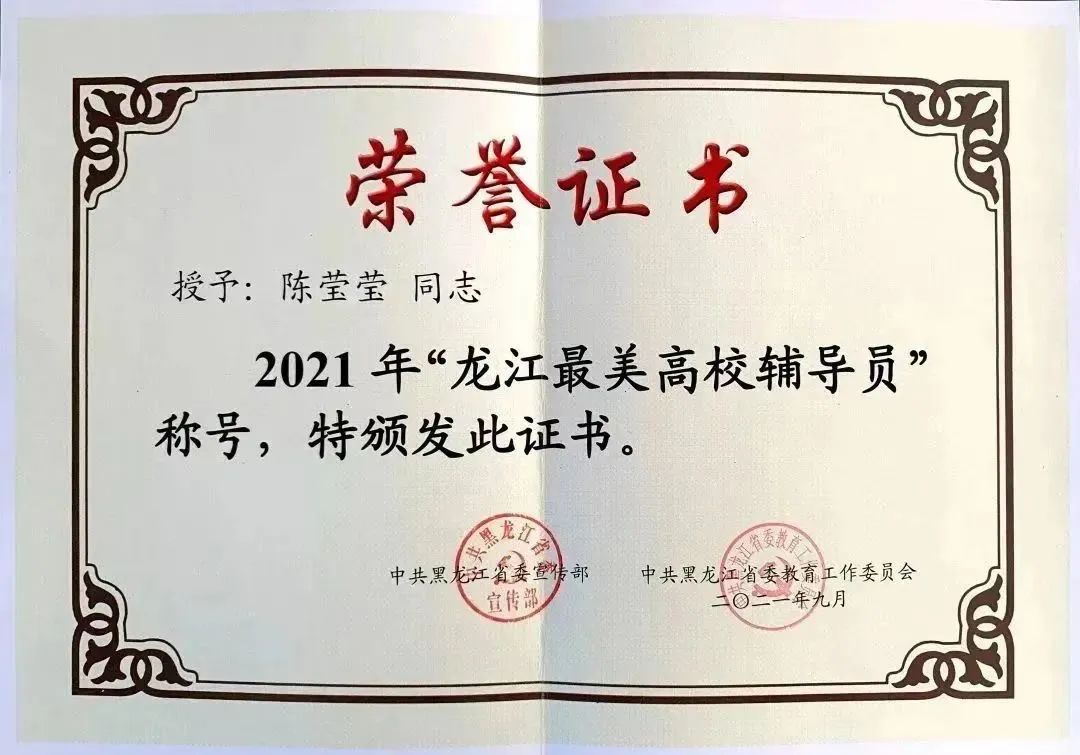 理论实践有提升。十年来,我校辅导员队伍建设结出累累硕果,实现了理论和实践两个层面双线提升、双线突破。其中,我校1名辅导员荣获全国“最美高校辅导员”、1名辅导员荣获全国高校辅导员年度人物、2名辅导员荣获全国高校辅导员年度人物提名奖、3名辅导员荣获全国高校辅导员年度人物入围奖、1名辅导员荣获全国辅导员素质能力大赛一等奖、1名辅导员荣获全国高校辅导员素质能力提升骨干训练营“特别表现奖”、3名辅导员荣获全国高校辅导员素质能力大赛优秀奖、3名辅导员荣获“龙江最美辅导员”、8名辅导员荣获黑龙江省高校辅导员年度人物;累计获得教育部人文社科(高校辅导员研究专项)2项,入选全国高校思想政治工作优秀论文5篇,入选全国高校思想政治工作优秀案例3个,20余名辅导员在黑龙江省辅导员素质能力大赛、黑龙江省高校思想政治工作优秀论文评选等活动中获奖。