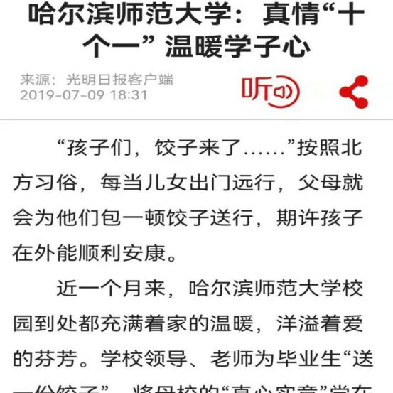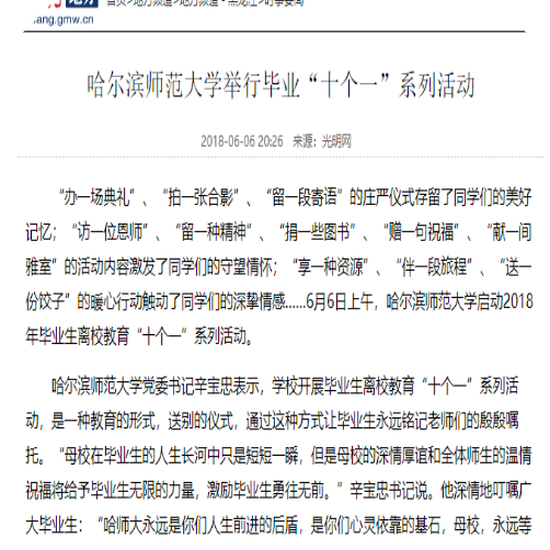 打造特色品牌活动。学校充分抓住新生入学、毕业离校两个重要时间节点,精心打造了新生入学“十个一”和毕业离校“十个一”教育活动,引导新生系好大学生涯的第一粒扣子,树立正确的世界观、人生观和价值观;引导毕业生坚定理想信念,明确奋斗方向,践行青春梦想。相关工作经验光明网、中国新闻网、凤凰网、东北网等主流媒体广泛宣传报道,得到了社会各界的一致好评。