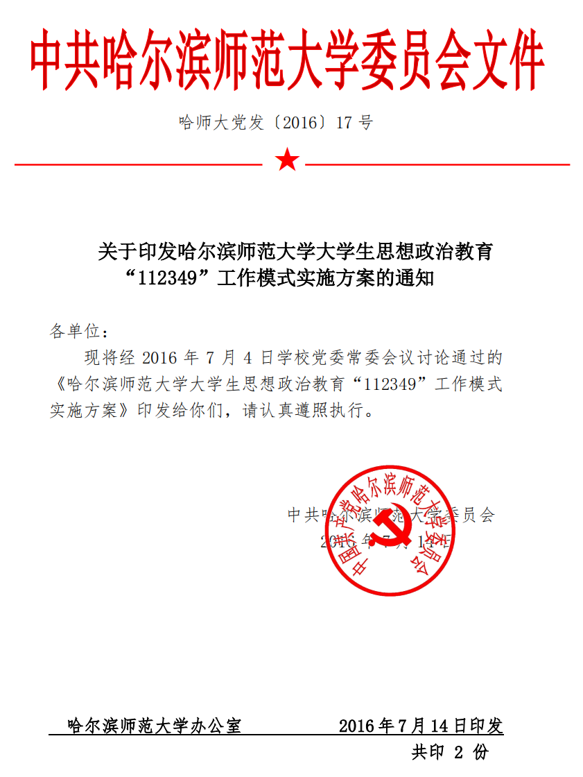 思政工作获得高度评价。2017年6月6日,时任教育部部长陈宝生到我校调研时评价我校思政工作:“有自己的特色,有自己的品牌,树立了自己的旗帜,应予充分肯定。”2017年7月6日,中宣部、中组部、教育部三部委督查我校落实全国高校思想政治工作会议精神时指出:“哈师大的思政工作一直在实践、一直在探索、一直在创新,为全国高校树立了榜样,工作经验值得在全国推广。”2018年5月,在本科教学工作审核评估中,审核评估专家组在反馈意见中明确指出,“哈师大一直以立德树人为根本任务,为国家经济建设和社会发展做出重要贡献。学校以创新构建‘112349’思想教育工作模式为抓手,形成了大思政的育人格局……营造了全员、全过程、全方位育人的良好氛围”。