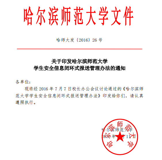 安全管理深入人心。2016年,学校科学制定并下发了《哈尔滨师范大学学生安全信息闭环式报送管理办法》,持续开展以平安校园、和谐校园、文明校园为主题的系列安全教育活动,切实提升学生安全意识和防范能力,打通安全管理“最后一公里”。截止到2022年10月,学校共收集处理了22个学院报送的涉及心理健康、流行疾病、诈骗受骗、校园安全、私自离校、身体疾病等534件B环安全信息;在学院内部报送了305件A环事件。每起事件都得到了有效解决,未发生一起影响恶劣的事件,有效保障学生安全,确保学校稳定。学校坚持每年召开少数民族学生专题工作会议、少数民族学生座谈会,贯彻落实“三进两联一交友”活动,深入开展“江疆一条心·牵手一家人”学校领导与少数民族学生结对子活动,努力营造“民族团结一家亲”的工作氛围,铸牢中华民族共同体意识。