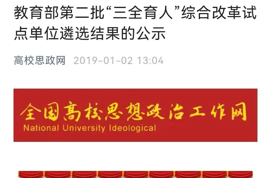 顶层设计取得良好效果。学校先后出台了《加强和改进新形势下思想政治工作的实施意见》《学生思想政治教育“主渠道”与“主阵地”一体化工作方案》《大学生思想政治教育“112349”工作模式实施方案》《哈尔滨师范大学“三全育人”综合改革试点建设方案》等文件,统筹推进大学生思想政治教育工作。2018年,我校《“112349”一体化实践育人模式探索》获批教育部高校思想政治工作精品项目。2019年,学校成功入选教育部“三全育人”综合改革试点单位,成为全国25所试点高校之一,相关工作经验被中国教育电视台等主流媒体广泛宣传报道,并在全国高校“三全育人”综合改革研讨会上作交流发言。