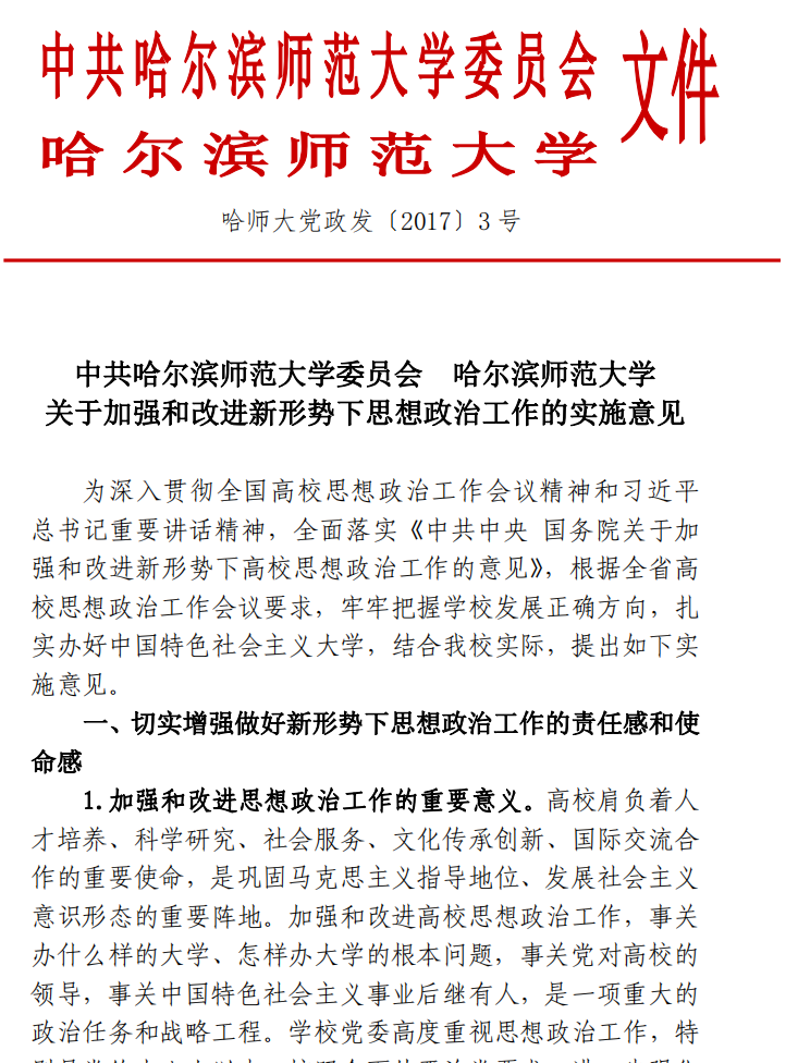 十八大以来,学校坚持以习近平新时代中国特色社会主义思想为指引,贯彻落实习近平总书记关于高校思想政治工作的重要论述和重要讲话精神,坚持立德树人根本任务,紧紧围绕“培养什么人”“如何培养人”以及“为谁培养人”这个根本问题,为党育人、为国育才。经过十年探索和实践,我校大学生思想政治教育工作取得了优异成绩,基本形成了具有师大特色,辐射全省乃至全国的哈师大大学生思想政治教育工作模式经验。