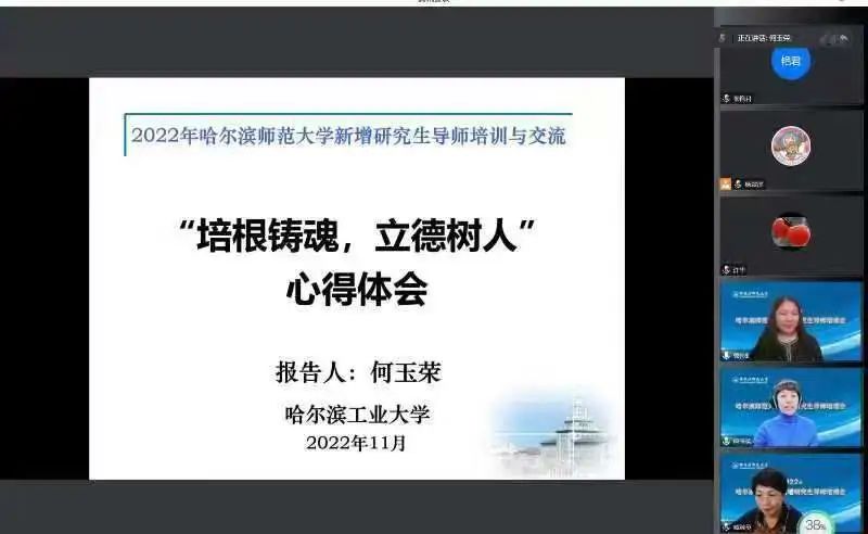 哈尔滨工业大学能源科学与工程学院教师、教育部能源动力类专业教学指导委员会委员、中国机械工业教育协会高等工程教育第一届新能源与储能工程专业教学委员会副主任委员、第四届能源与动力工程专业教学委员会委员、中国工程热物理学会多相流分会副主任委员及黑龙江省重点实验室主任、博士研究生导师何玉荣教授为新增选研究生导师作了一场题为《“培根铸魂,立德树人”心得体会》的精彩报告。报告从党的二十大报告指出的“教育、科技、人才是全面建设社会主义现代化国家的基础性、战略性支撑”出发,结合自身在科学研究和人才培养中积累的经验,从“加强新时代思想政治教育”、“提升教师自身师德修养”、“建立良好师生关系”及“提高研究生培养质量”等方面分享了立德树人、教育教学、人才培养、科学研究等方面的心得体会以及培养成效。整篇报告既有对国家最新文件的深入解读,又有对育人本质的学理思考,还有对立德树人实践过程的深刻反思与感悟,为新增导师高质量落实导师育人职责提供了十分有益地借鉴。