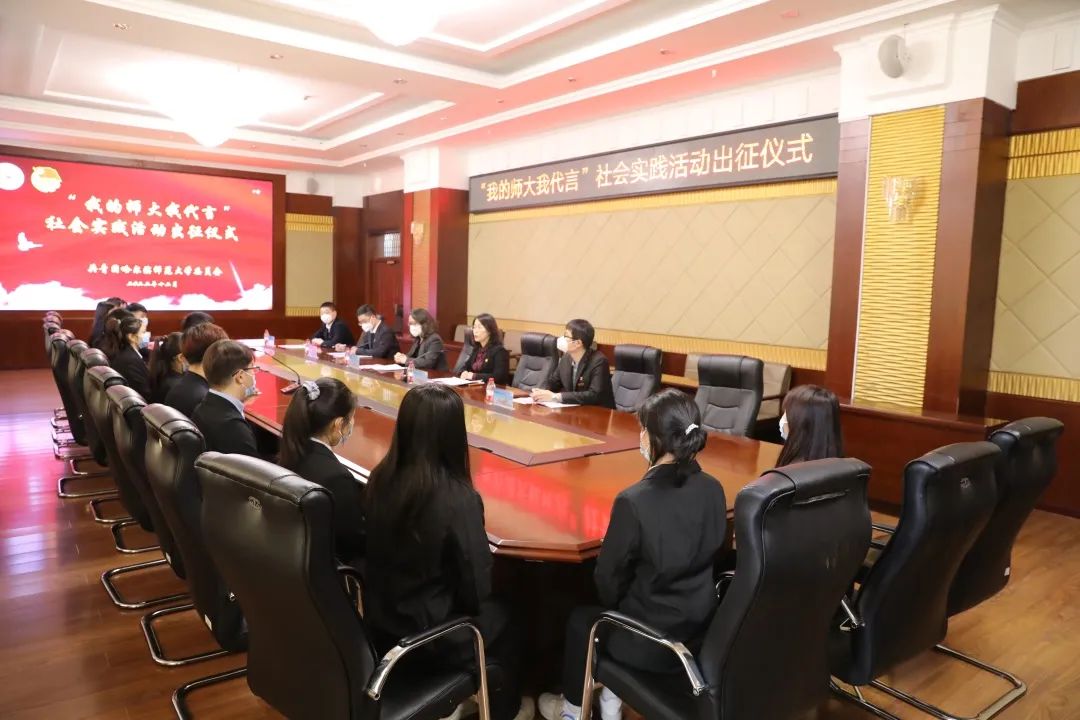 出征仪式上,校团委副书记徐慧文受招生工作处委托介绍了“我的师大我代言”社会实践的活动背景。校党委副书记、工会主席郭砾为实践团队授旗并向各实践团队发放宣传手册、防疫包等活动物资。