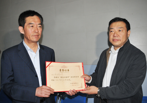 图 王广明代表学校接过基金会捐款的荣誉证书