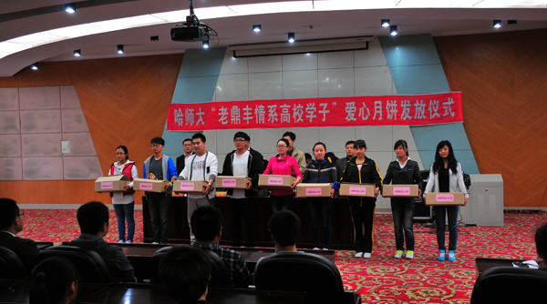 在中秋佳节来临之际,在省教育厅学生处的协调和沟通下,牵挂高校贫困学子的哈尔滨老鼎丰食品有限公司为我校近万名困难学生送来中秋佳节的问候。9月26日上午,哈尔滨师范大学“老鼎丰情系高校学子”爱心月饼发放仪式在江北校区图书馆一楼报告厅隆重举行。党委副书记王为正,学生工作处相关领导以及江北校区各学院学工办主任和困难学生代表共计150余人参加仪式。