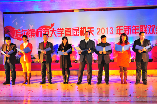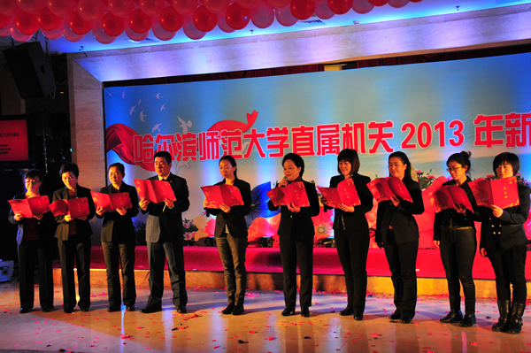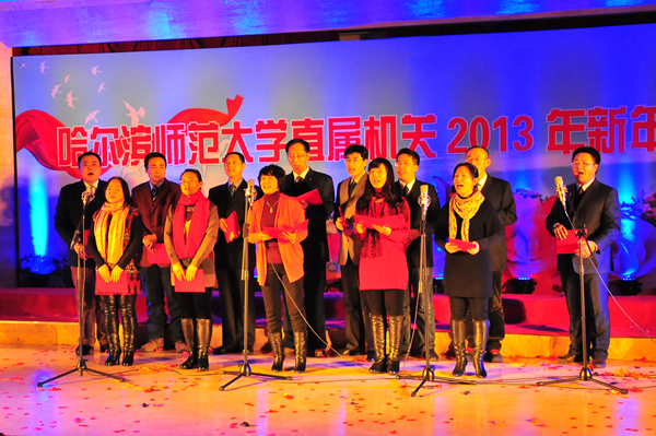 踏歌起舞辞旧岁,欢声笑语迎新年。2012年12月27日下午,松北校区梦溪宾馆金色大厅内张灯结彩,欢声笑语,一派浓浓的节日喜庆氛围,直属机关2013年新年联欢会在此隆重举行。校党委书记,校长王选章,党委副书记王为正,党委常委、副校长徐晓风,党委常委、纪委书记蒋晶洁,党委常委、工会主席张国昭,党委常委、党委组织部部长尹占军,总会计师李金贵等领导及直属机关全体干部职工欢聚一堂,共贺新年。