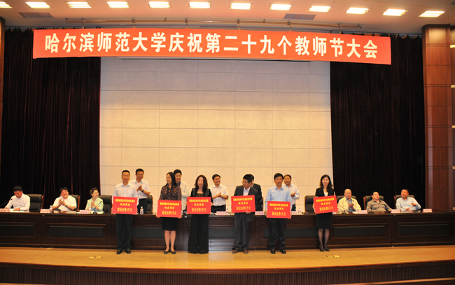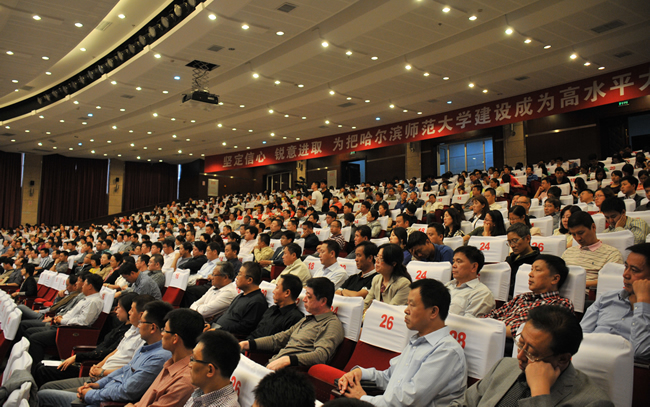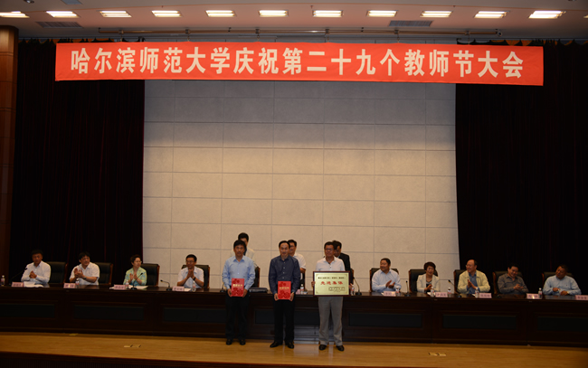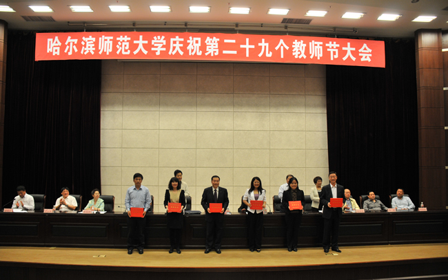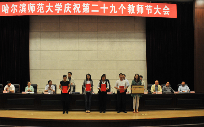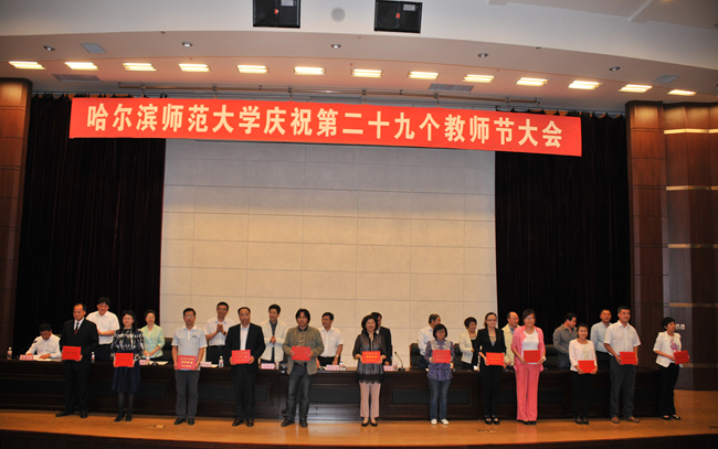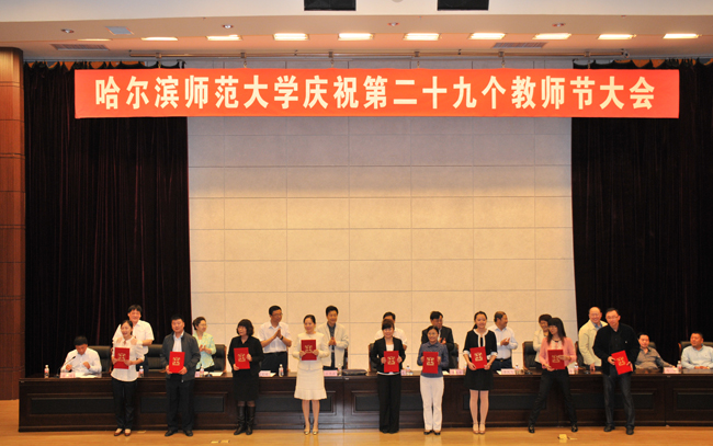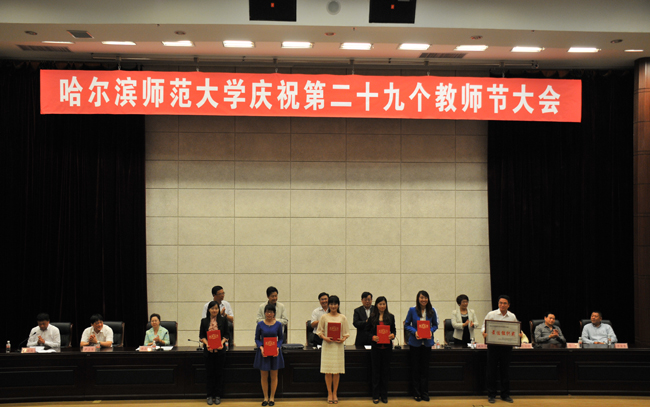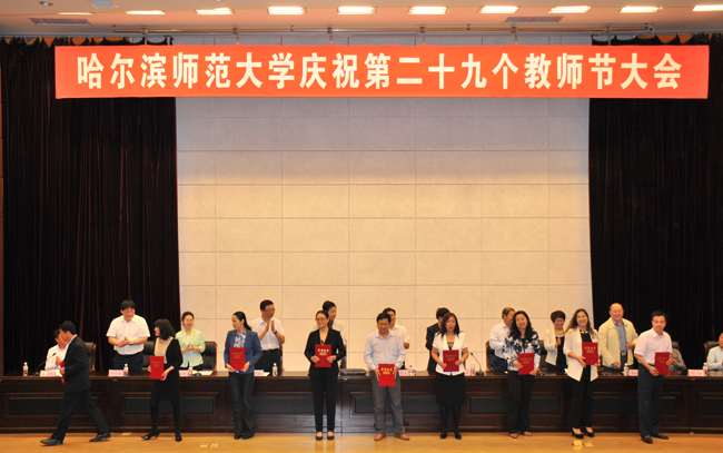 大会在雄壮的国歌声中拉开了帷幕。校长王选章宣读了哈尔滨师范大学《关于表彰2013年国家级“本科教学工程”项目的决定》;党委副书记王为正,党委常委、副校长曹百瑛,党委常委、副校长李凤飞,副校长臧淑英,党委常委、纪委书记蒋晶洁,党委常委、工会主席张国昭分别宣读了哈尔滨师范大学《关于表彰省级本科专业综合改革试点项目的决定》、《关于表彰省级教学成果奖的决定》、《关于表彰“三育人”先进集体和先进工作者的决定》、《关于表彰黑龙江省高校第二届青年教师教学竞赛获奖教师和获奖集体的决定》、《关于表彰省级教师微课教学比赛获奖教师和获奖集体的决定》、《关于表彰第六届校级“教学名师奖”、第四届校级“中青年教师优秀教学奖”、2013年度“宁齐堃优秀教学奖”获奖教师的决定》和获奖教师名单。在欢快喜庆的音乐伴奏下和全场师生热烈的庆祝掌声中,学校领导为获奖单位和教师代表颁奖。