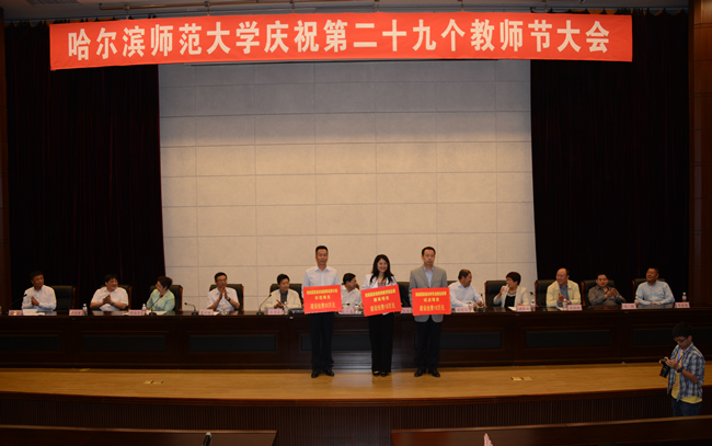 党委书记在会上讲话。校党委书记代表学校党政领导向长期奋战在教学科研第一线的教师和教育工作者致以节日的祝福,向为学校的建设和发展做出重要贡献的离退休老教师、老同志致以诚挚的问候,向受到表彰的老师们致以热烈的祝贺。校党委书记指出,我校广大教师和教育工作者在平凡的工作岗位上不辞辛劳,默默耕耘,充分发挥了教师“传道、授业、解惑”的作用,为学校的人才培养工作和各项事业的蓬勃发展做出了突出贡献,为国家和社会培养了一批又一批适应社会发展需要的高素质人才。就如何发挥教师队伍在学校当前事业发展建设中的作用,校党委书记强调,全校上下要继续统一思想,加强和保证教学工作的中心地位,全面提高人才培养质量;要继续坚持以教师为本,进一步加强教师队伍建设,大力促进每个教师的成长发展和教师队伍整体实力的增强;广大教师要认真履行教书育人的光荣职责,用踏实勤恳工作为学校各项事业贡献力量。校党委书记希望广大教师争当“为人师表、关爱学生”的育人典范,继续践行“学高为师、身正为范”的精神追求,积极投身学校各项事业建设,以主人翁的姿态建设好大家共同的家园。