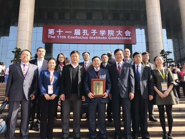 国务院副总理、孔子学院总部理事会主席刘延东出席大会并发表主旨演讲,并为全球孔子学院先进个人和先进单位颁奖。我校因工作成绩突出,被评为孔子学院先进中方合作机构,这是我校首次获此殊荣。校党委书记应邀出席大会,并代表学校接受刘延东副总理颁发荣誉奖牌。
