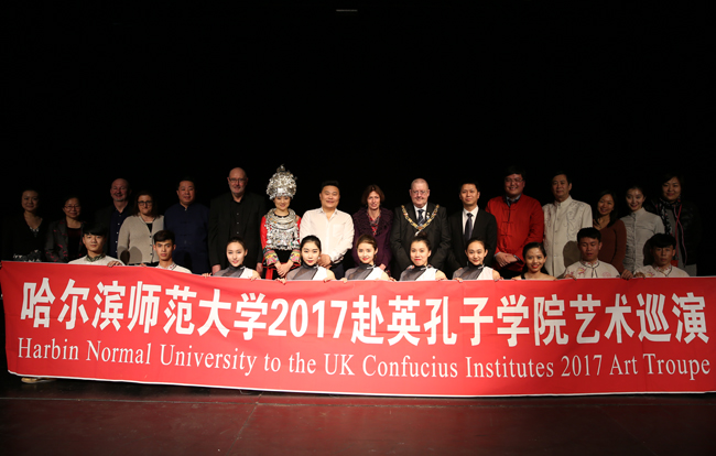 演出结束后,兰卡斯特大学孔子学院英方负责人对演出予以高度评价。Mr.Dow表示,哈尔滨师范大学演出团队以专业的态度,精湛的艺术造诣,呈现了一场高水平的、令人赞叹的演出。海外巡演以中国传统艺术为媒介,使英国观众有机会近距离接触中国元素,对促进两国人民精神和心灵的沟通具有十分重要的意义。最后,兰卡斯特市市长、观看演出的VIP观众和兰卡斯特大学孔子学院员工上台与巡演团成员握手致谢并合影留念。