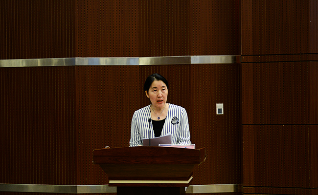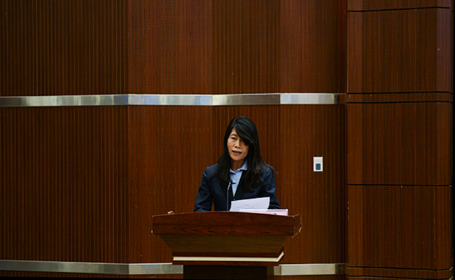 图 西语学院英语教育系第一党支部书记范丽娟在会上作交流发言