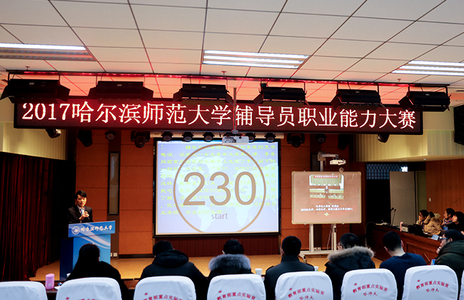 (仲微微/文)为深入学习贯彻党的十九大精神,落实立德树人根本任务,践行社会主义核心价值观,推动和引领辅导员职业化、专业化、专家化的发展,促进辅导员间互相交流与学习,进一步提高广大辅导员的职业技能和服务水平,由学生工作部(学生处)、教育部高校辅导员培训和研修基地(哈尔滨师范大学)联合举办的2017哈尔滨师范大学辅导员职业能力大赛于12月25日拉开了序幕。大赛历时两天,有16名选手参赛,邀请省内七所高校的学工专家担任评委。我校党委常委、副校长杨锐锋出席比赛并讲话,学生工作部(学生处)相关人员、各学院党委副书记、全体辅导员100余人观摩了大赛。