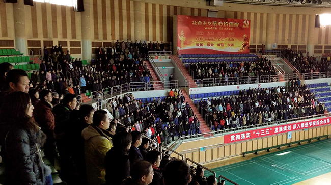 2月25日下午14时,江北校区体育馆内掌声雷动、群情激昂,学校2018年工作会议在这里隆重召开,在职教职工2600余人参加会议。这是我校第一次召开的由全体在职教职工参加的最大规模的年度工作部署会议,意义深远。省精神文明办专职副主任刘维宽,我校党委书记、校长孙立军等学校领导出席会议。党委常委、副校长杨锐锋主持会议。