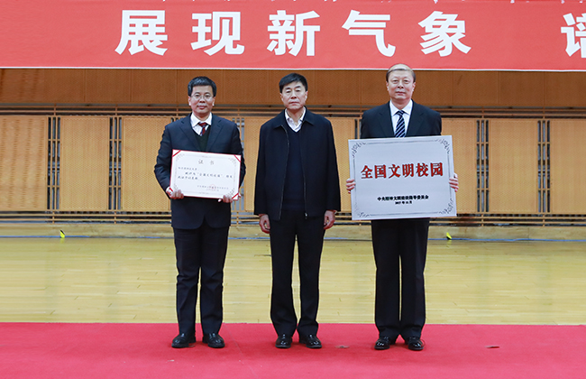 图 省精神文明办专职副主任刘维宽为我校颁发首届“全国文明校园”奖牌及证书,党委书记、校长孙立军代表学校接受颁奖
