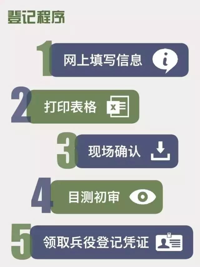 五、批准入伍:体检政审合格,符合参军入伍条件的由应征地兵役机关批准入伍。按具体要求在指定时间地点领取入伍相关物品、办理相关手续。
