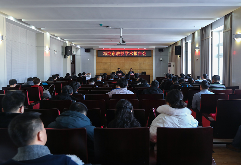 为持续深入学习习近平新时代中国特色社会主义思想,贯彻落实党的十九大精神,1月7日上午,学校党委举办2019年首次专题理论学习,特别邀请中国社科院马克思主义研究院党委书记、院长、博士生导师邓纯东教授作学术报告。各基层党委书记,各学院党委副书记、辅导员,党委宣传部(省高校思想政治理论课教师培训和研修基地)、学生工作部、团委、教育部高校辅导员培训和研修基地全体工作人员,马克思主义学院教师和研究生代表参加报告会。学校在江南校区设视频分会场。校党委副书记杨锐锋主持报告会。