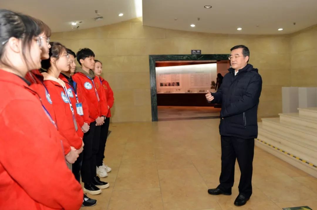 张庆伟在哈尔滨师范大学文博馆,询问大学生志愿者对开好思政课的意见。