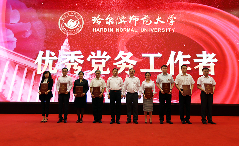 表彰大会在各基层党委风采展示宣传短片中拉开帷幕,各基层党组织代表、优秀党务工作者代表、优秀共产党员代表用真诚、质朴的语言表达了他们对党的忠诚热爱,展现了他们在一线教学科研岗位上无私奉献的忘我精神和在党的事业中坚守初心的高尚情怀。党委副书记杨锐锋宣读了《中共哈尔滨师范大学委员会关于表彰2018-2019年度先进基层党组织、优秀党务工作者和优秀共产党员的决定》,对获得荣誉称号的47个基层党组织,46名党务工作者, 62名共产党员表示祝贺,并号召学校各基层党组织要向受表彰的先进基层党组织学习,要求广大党务工作者和共产党员要以受表彰的优秀个人为榜样,主动作为、敢于担当,以强烈的事业心和责任感做好本职工作,努力创造新的业绩。