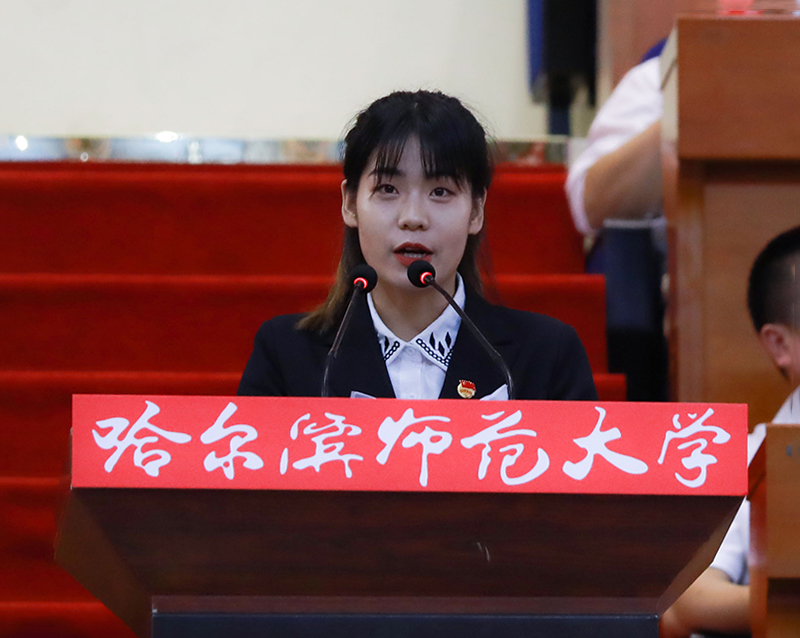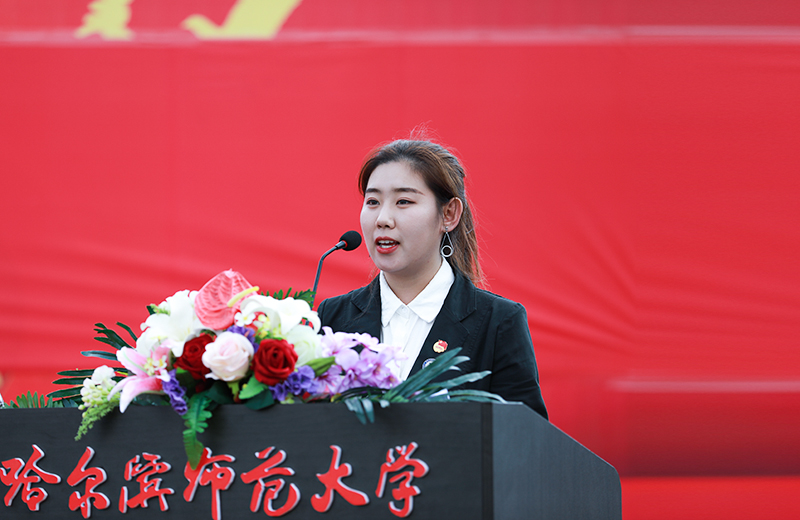 在校学生代表、校学生会主席、地理科学学院2017级地理科学专业董倩,江南校区学生会主席、传媒学院2017级广播电视学专业王茜在发言中,希望新一代哈师大人能够在敦品励学、弘毅致远的校训引领下,以青春之我,创造青春之中国。在实现中华民族伟大复兴的时代潮流中勇于担当、有所作为,创造属于自己的精彩人生。