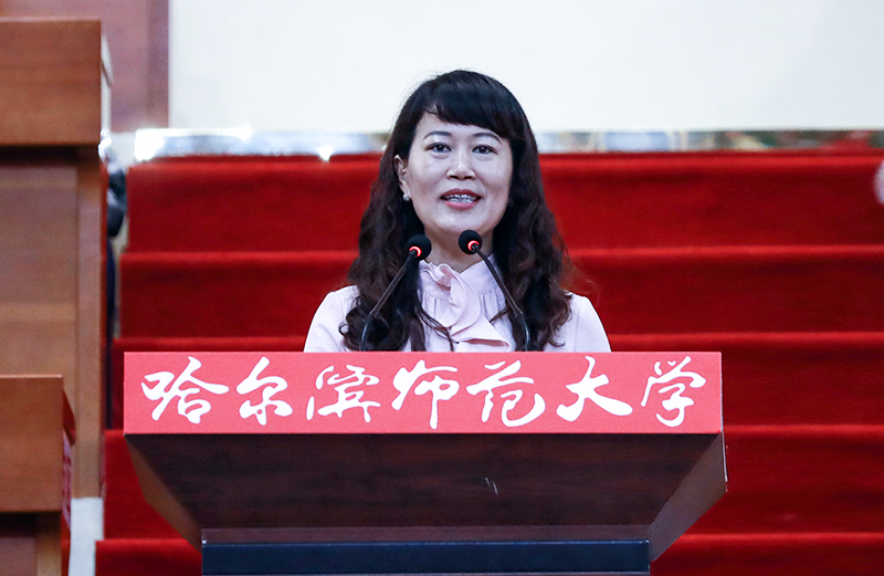 教师代表、全国党建样板支部书记、省首届思政课教学大奖赛一等奖获得者、哈师大“宁齐堃”中青年教师课堂教学优秀奖获得者、马克思主义学院熊玉坤,美术学院装潢艺术设计系副主任黄茜分享了自己的成长经历与教学经验,希望同学们能够珍惜在师大学习的机会,不忘初心,牢记使命,砥砺前行,奋发有为,在新的长征路上,为哈师大、为祖国续写新的壮美篇章。