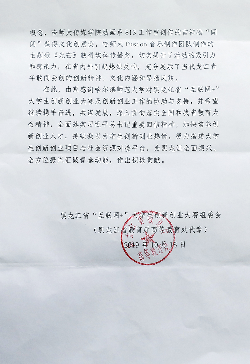 (盛志伟/文)近日,我校喜获黑龙江省“互联网+”大学生创新创业大赛组委会发来的感谢信,致谢我校对黑龙江省“互联网+”大学生创新创业大赛及创新创业工作的协助与支持,并希望继续携手奋进,共谋发展,深入贯彻落实全国和我省教育大会精神,全面落实习近平总书记重要回信精神,加快培养创新创业人才,持续激发大学生创新创业热情,努力搭建大学生创新创业项目与社会资源对接平台,为黑龙江全面振兴、全方位振兴汇聚青春动能,作出积极贡献。