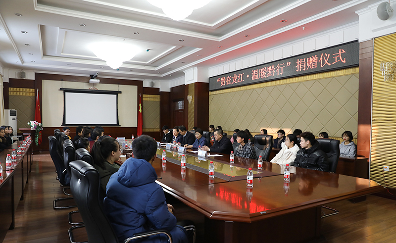 (庞春妍/文)12月25日下午,我校教育发展基金会“贵在龙江·温暖黔行”捐赠仪式在行知楼举行。副校长臧淑英,党办主任、基金会秘书长宿建,学生工作部(学生处)部(处)长王彦庆,捐资方哈尔滨市同鑫宏业商贸有限公司董事长秦瑞新、总经理董林光,贵州茅台销售有限公司哈尔滨市经理喻深伟出席仪式。我校贵州籍2018级、2019级特困学生参加捐赠仪式。仪式由基金会秘书庞春妍主持。