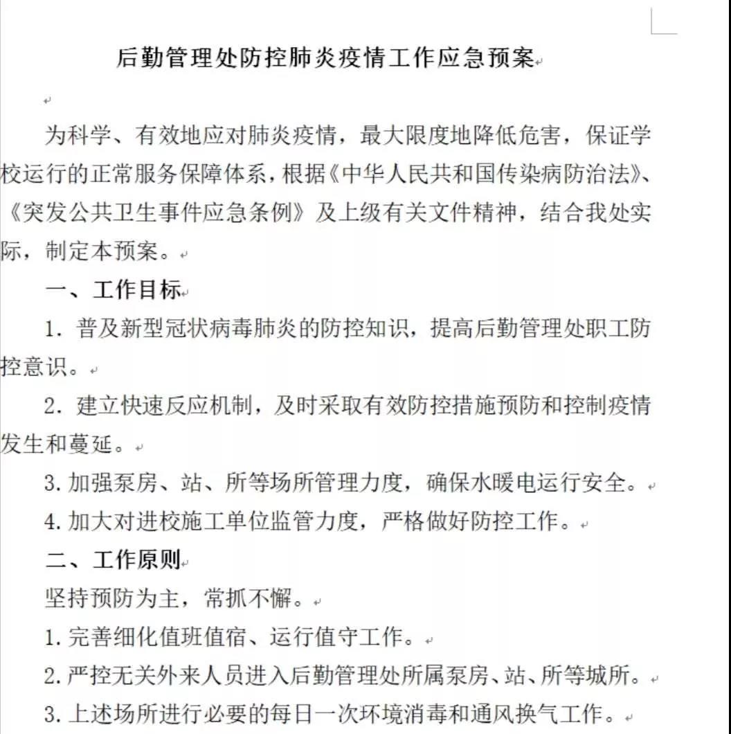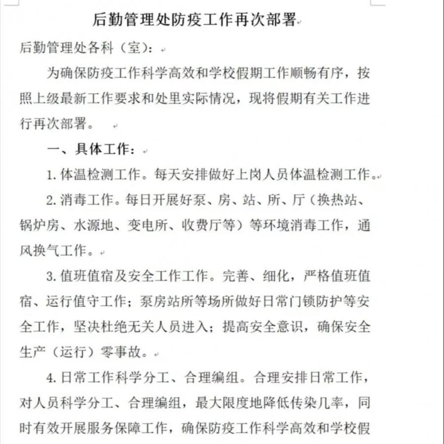 疫情就是命令,防控就是责任,按照学校防控疫情工作指示,后勤管理处提高站位、快速响应,统一部署、高效落实。1月24日抗“疫”以来,建立由所有处班子成员和科室负责人组成的“后勤管理处新冠疫情防控工作群”,明晰组织机构,厘清责任分工;制定《后勤管理处防控肺炎疫情工作应急预案》、《后勤管理处防疫工作“再次部署”工作通知》、《后勤管理处防疫物资发放情况说明》、《各科室“防疫”工作计划》等系列工作制度和工作要求,科学防疫强化措施,压实责任合理分工;建立机动灵活的服务保障模式,不搞大规模集团作战,结合不同岗位和工作性质,创新服务保障方式方法,确保服务保障工作有序顺畅;网格化防控,属地化管理,执行有效防控措施和责任追查机制,做到既有效防控疫情,又能及时解决服务和保障的民生问题;加强泵房、站、所等场所管理力度,确保安全生产(运行)零事故;确保环境卫生消毒、通风,人员戴口罩、洗手和体温检测做为工作常态和防护基本要求,建立工作日志,任务到具体时间段,责任到具体人,全力确保水暖电正常运转;全力配合学生工作处、医院等职能部门做好“隔离室”改造,克服电焊工人员不足、施工难度大、任务艰巨等不利因素,快速高效配合保卫处进行校园围墙缺口全方位修复、封闭等,为校园整体防疫封闭工作全力做好设施保障工作;完善服务保障快速反应机制(“五级报修制”),确保防疫工作力度不松劲,服务保障质量不滑坡。