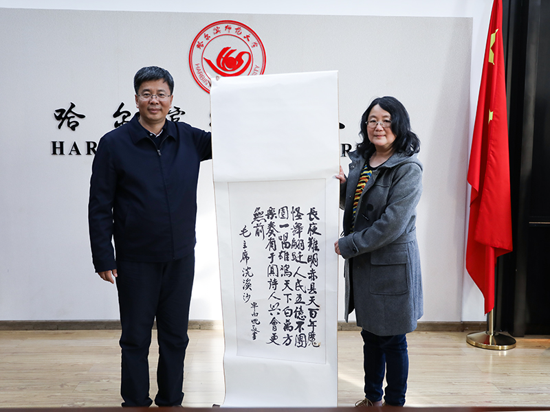 捐赠仪式上,詹洪阁先生向我校捐赠了其收藏多年的1951年《松江省师范专科学校创校纪念册》、1954年《哈尔滨师范专科学校毕业证书》、1960年《哈尔滨师范学院毕业文凭》、1964年《哈尔滨师范学院政治系毕业同学(第一班)临别纪念册》等多件我校早期校史文献资料。车红女士向我校捐赠了沈阳故宫博物院收藏的其祖父车向忱先生书写的《毛主席诗词·浣溪沙》(复制品)。