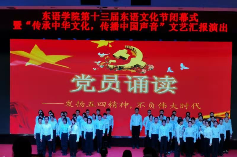 闭幕式上,歌舞、诗朗诵、大合唱、T台秀、舞蹈书法等12个节目为观众呈现了一场视听盛宴。在开场视频中,一幕幕东语学院的难忘瞬间,学院取得的累累硕果和同学们相亲相爱的照片,令人心潮澎湃。开场舞《中国》惊艳四座,体现出舞蹈的柔和美丽,展现了学院学子的良好精神风貌;全体学生党员诵读《发扬五四精神,不负伟大时代》让人感受党的强大力量,进一步增强爱党与爱国情怀;双人演唱《天耀中华》,歌声悠扬淳朴,唱进每个人的心里;诗朗诵《携手共筑中国梦》表达出学子们对祖国的美好祝愿;师生合唱《中国》温馨和睦,彼此陪伴;由舞蹈与书法共同描绘的《雨醉江南》共赴梦里江南烟雨、醉红尘弱水三千;优美的舞姿配上豪迈的书法,珠联璧合。学院合唱团全体成员大合唱《我爱你中国》唱响祖国千年美丽,唱出家国情怀;现代舞《舞蹈串烧》展现当代大学生的青春活力;学院全体运动员表演手势舞《我相信》将坚持和毅力写在他们的笑脸上;四人合唱《不忘初心》诉说心中理想,坚定心中信念,不负韶华、不负青春;别出心裁的T台服装走秀《活力东语》令同学们大开眼界。独具特色的东语风格、日韩阿三国服装的展示,烘托出文化的多样性,推动文化交流。