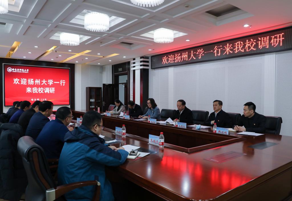 12月10日上午,扬州大学党委副书记叶柏森,党委常委、宣传部长张信华等一行7人来我校调研。我校党委副书记、工会主席郭砾,党委常委、宣传部长姜玉洪及有关部门负责人热情接待,并在行知楼915会议室举行座谈交流。