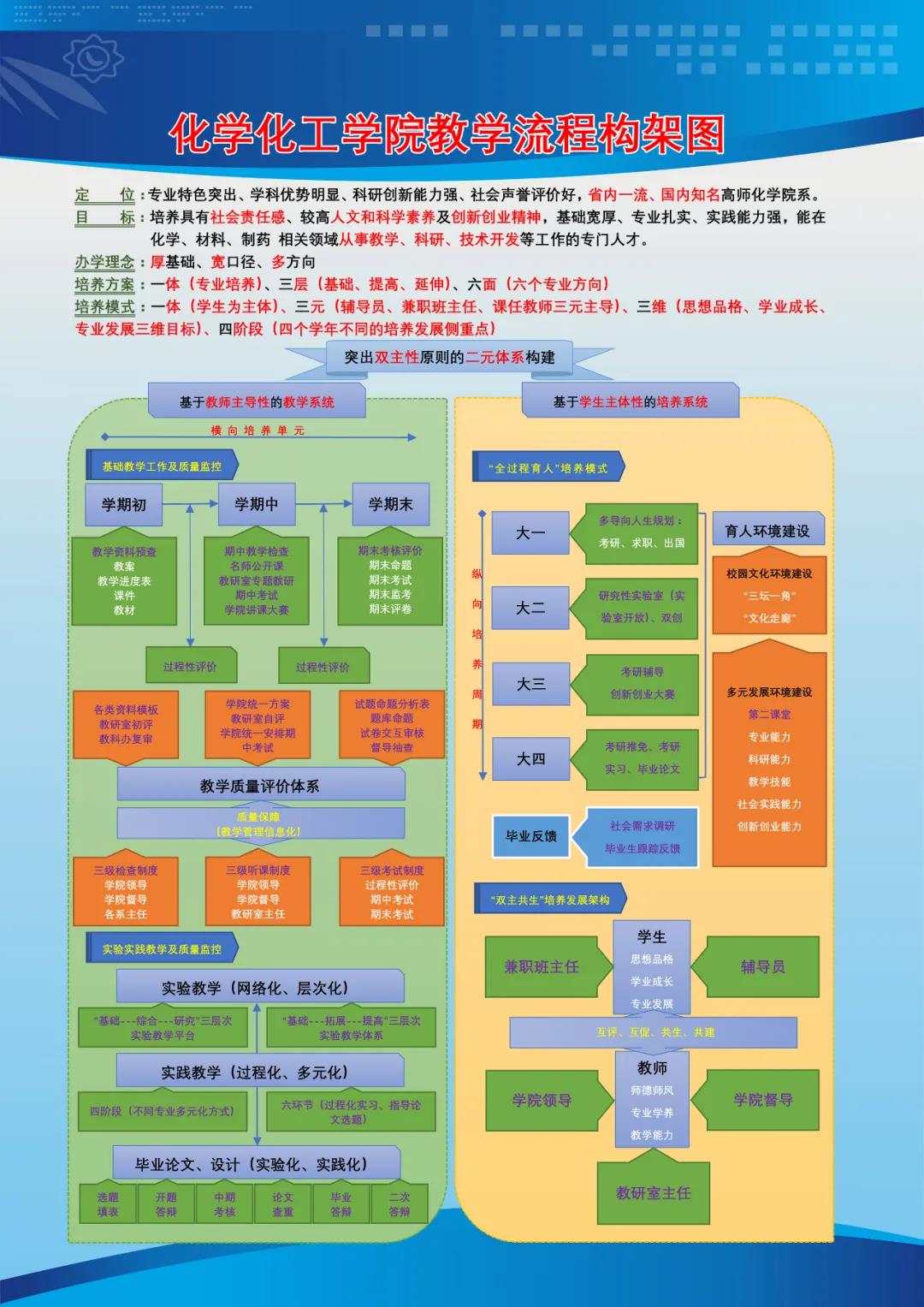 化学化工学院以立德树人为根本任务,以“立足龙江、面向行业、服务全国”为指导思想,坚持“学生中心、产出导向、持续改进”理念,提出“三元三维四阶段”全育人培养模式,构建“一体、多元、动态优化”课程体系,以培养方案、教学大纲为切入点,通过顶层设计,从培养体系、保障体系、评价体系全方位入手,建立全员育人的专业发展格局。七十年来,学院为我国教育事业培养出一大批优秀人才,为祖国和龙江大地的基础教育、文化建设和社会发展做出了巨大贡献。其中有任职于全国人大、省、市的各级领导,“国家杰出青年基金”获得者等学术专家,有卓越企业家和行业精英,更有一大批名校校长、特教及各级名师。