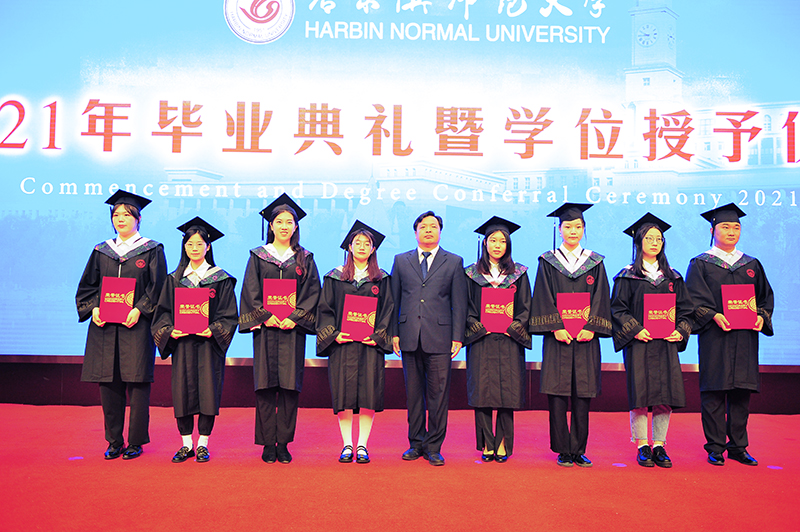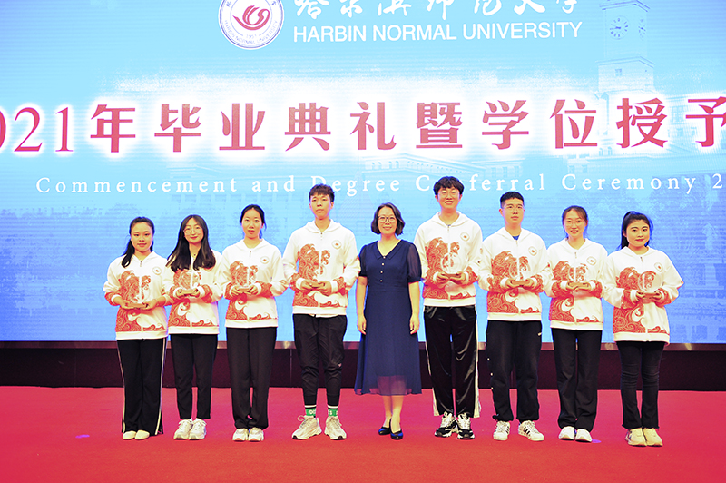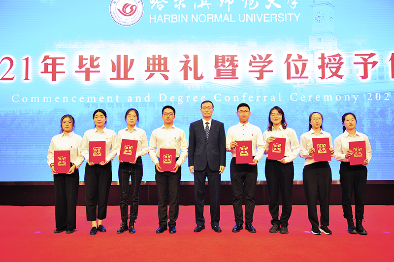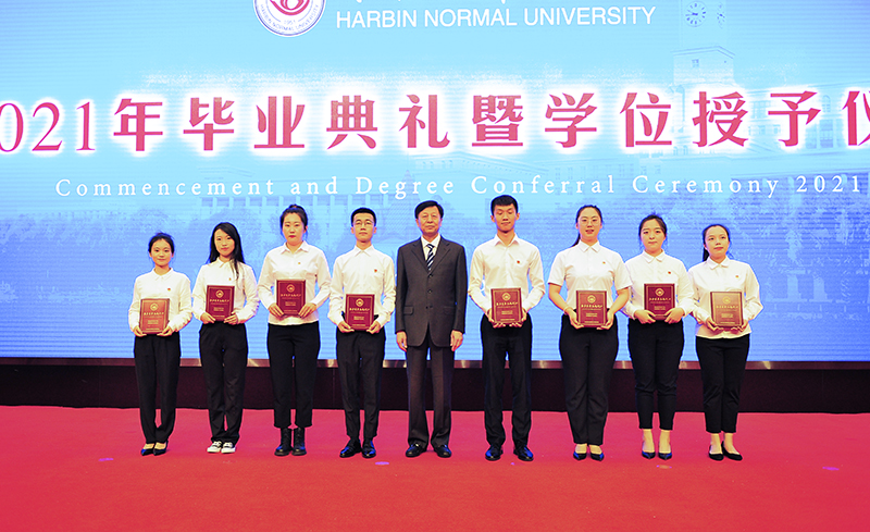 伴随着欢快而喜庆的乐曲,校党委书记为2021届优秀毕业生代表颁发荣誉证书;党委副书记杨锐锋为选调应届优秀毕业生到基层工作人员代表颁发纪念奖牌;党委副书记、工会主席郭砾为“大学生志愿服务西部计划”志愿者代表颁发纪念奖牌;党委常委、纪委书记、省监委驻哈尔滨师范大学监察专员郭加利为“宁齐堃”奖学金获得者代表颁发证书;党委常委、副校长尹剑锋为田家炳优秀师范生奖学金获得者代表颁奖。