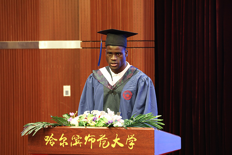 留学毕业生代表、国际教育学院汉语国际教育专业硕士2021届毕业生李君昊在发言时,深情回忆了在哈师大学习的点点滴滴,分享了疫情期间的难忘经历,向老师、同学以及母校表达了衷心的感谢和真诚的祝福。他承诺,未来将用自身所学传播中华文化,讲好中国故事。