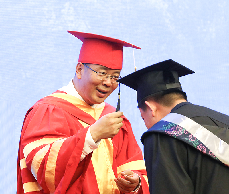 图 校学位评定委员会主席、校长、博士研究生导师孙立军教授为毕业生代表授予学位、拨流苏