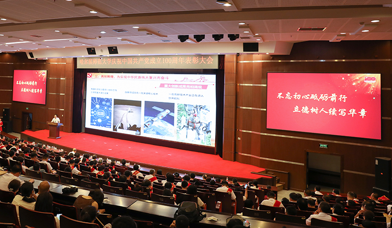 孙立军指出,我们党成立以来的100年,是把马克思主义同中国实际相结合、探索救国图强真理、开辟中华民族伟大复兴道路的100年,是带领人民不屈不挠、不畏艰难困苦、历经千锤百炼的100年,是始终站在时代前列、不断创造辉煌业绩、赢得人民衷心拥护的100年。历史和现实雄辩地证明,中国共产党不愧为伟大、光荣、正确的马克思主义政党,不愧为中国工人阶级的先锋队、中国人民和中华民族的先锋队,不愧为中国特色社会主义事业的坚强领导核心。他强调,今天我们召开庆祝中国共产党成立100周年表彰大会,表彰一批为学校改革发展事业作出突出贡献的先进基层党组织、优秀党务工作者和优秀共产党员,同时重温党的光辉历程,传承党的优良传统,正是对党的百年华诞的最好庆祝。