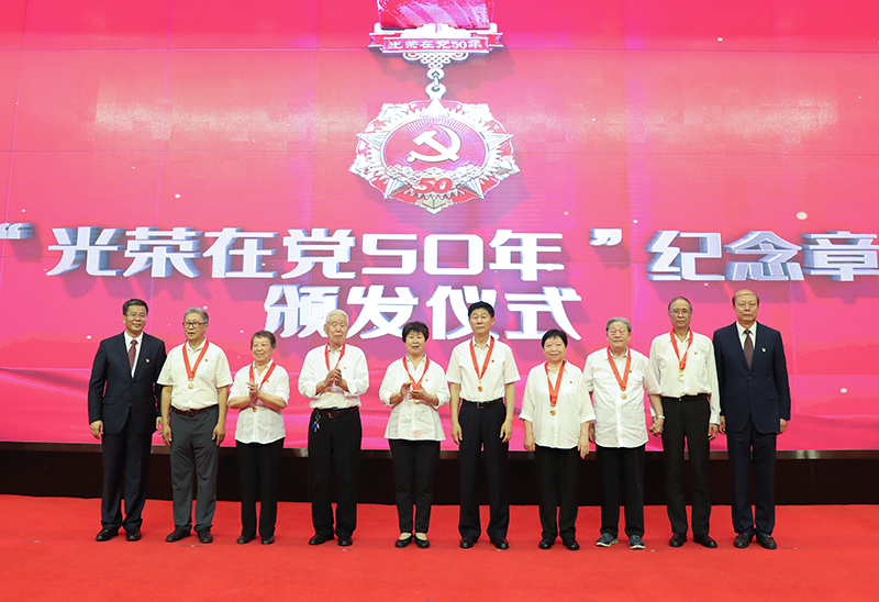 图 党委书记和党委副书记、校长孙立军为中 共中央“光荣在党五十年”纪念章获得者代表佩戴了纪念章
