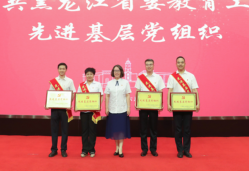 图党委常委、纪委书记,省监委驻哈尔滨师范大学监察专员郭加利为获得学校表彰的先进基层党组织代表颁奖