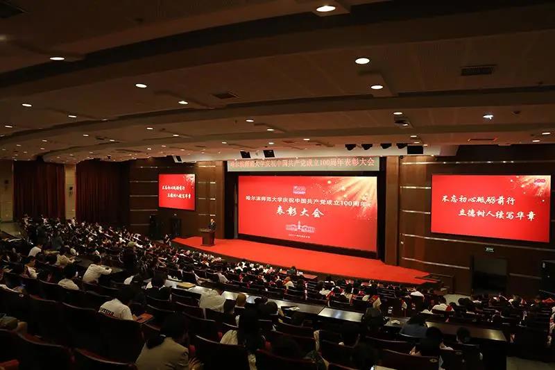 一台庆祝大会庄重热烈。学校党委统筹安排,党委组织部精心策划,一场庄严隆重气氛热烈的庆祝中国共产党成立100周年表彰大会给全校党组织和党员留下了深刻而难忘的记忆。在《红旗颂》深挚动人的旋律中,学校党政领导为获得表彰的先进集体和个人颁发奖牌和证书,鼓励他们要以强烈的事业心和责任感做好本职工作,努力创造新的业绩。8位获得“光荣在党50年”纪念章的老党员代表发言让全场党员全程肃立,响起经久不息的掌声,掀起了大会的高潮。马克思主义学院教授、博士生导师陈宪良以《初心不改、本色依旧》为主题的党课,带领现场党员回顾了建党百年的光辉历程。党委书记发表讲话、带领全体党员重温入党誓词再一次把大会推向了高潮,全校各级党组织和广大党员将以此次表彰大会为契机,共同努力,牢记为党育人、为国育才使命,助力学校早日实现国内一流师范大学的奋斗目标,书写龙江高等教育“奋进之笔”的新篇章,为全面建设社会主义现代化新龙江作出更大贡献。