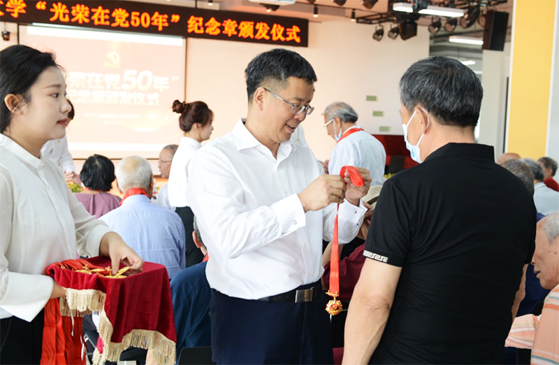 一枚纪念章震撼心灵。6月25日,学校党委为获得中央“光荣在党50年”纪念章的党员举行了一场特殊的仪式,学校领导逐一为到现场的60余名老党员佩戴纪念章,感谢他们为党和国家作出的贡献,感谢他们为学校建设发展付出的辛劳。老党员们佩戴这枚沉甸甸的纪念章,表示这是自己作为党员的崇高荣誉,也是自己拥护中国共产党领导的有力见证。