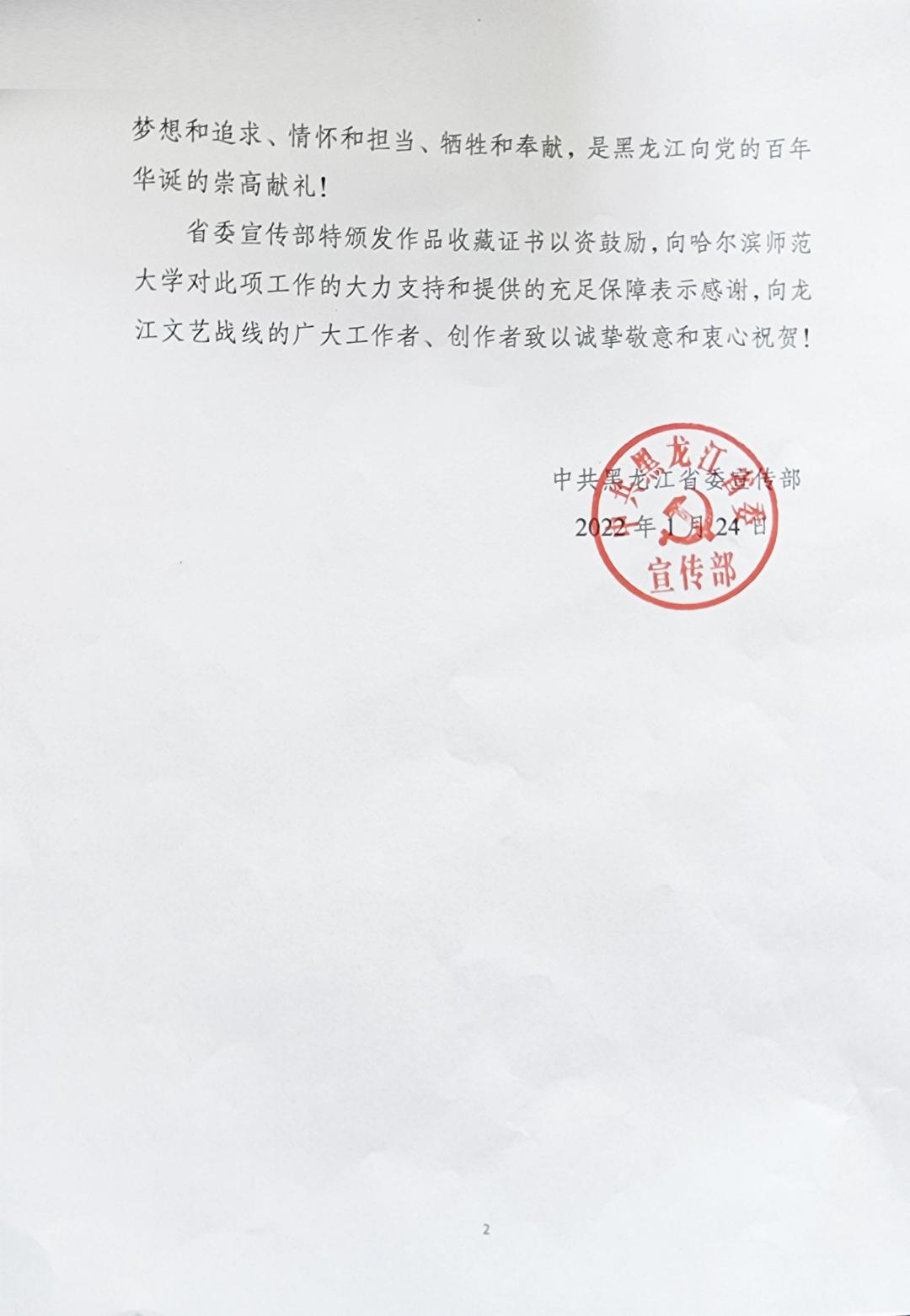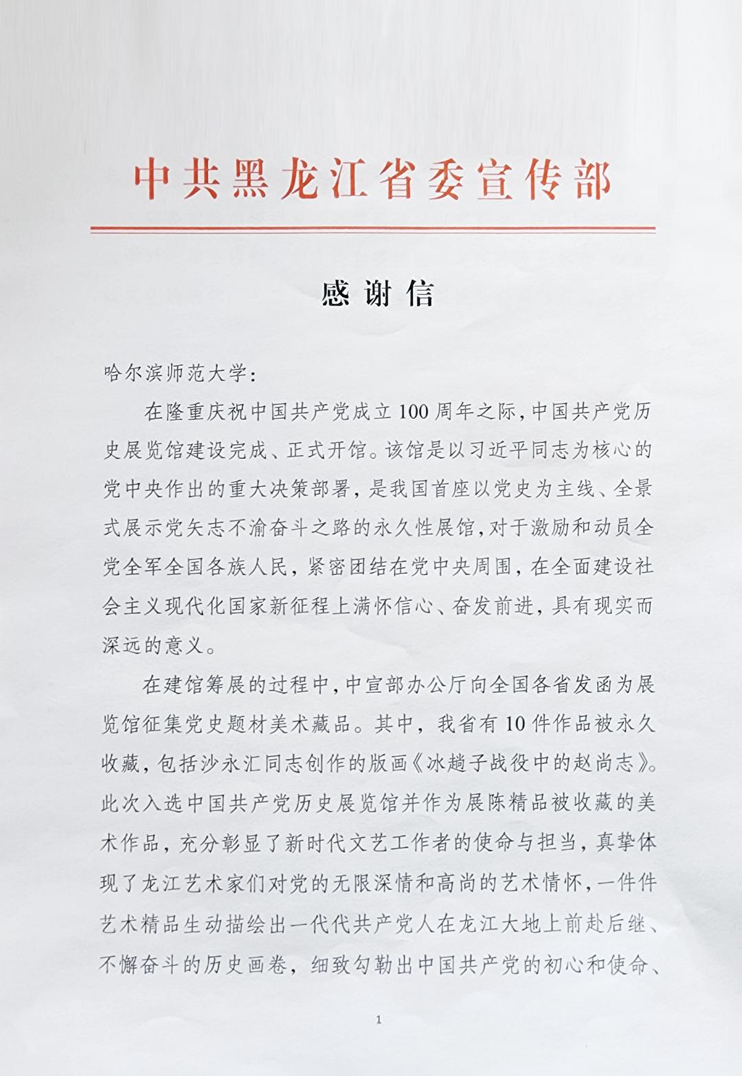 黑龙江省委宣传部发来感谢信,向我校对此项工作的大力支持和提供充足保障表示感谢,并向我校文艺战线的广大工作者、创作者致以诚挚敬意和衷心祝贺。