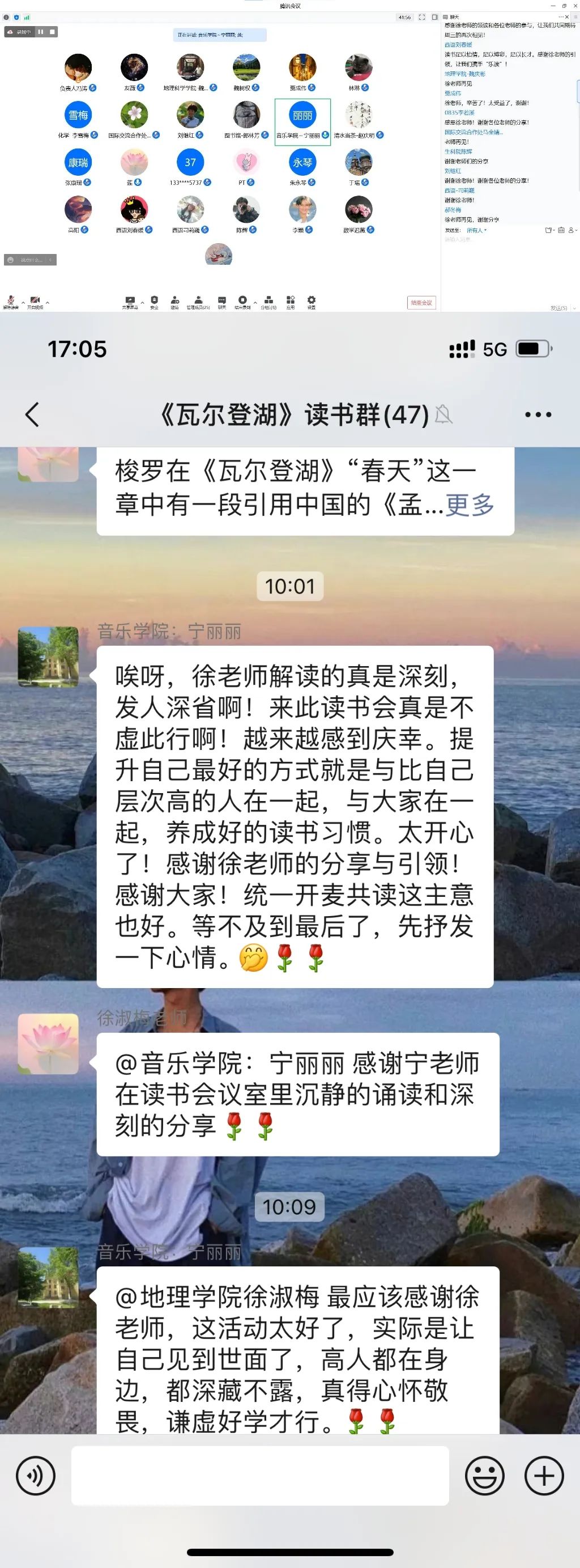 徐淑梅老师领读的《瓦尔登湖》带领我们更贴近自然,感受湖水的清澈与宁静,给心灵安顿的空间和时间。各位老师通过腾讯会议诵读经典段落,联系生活实际进行心得体会分享,感受最质朴、最纯真的自然。徐淑梅老师结合中外文化相通之处,将书中经典与道家智慧相联系,在读书中感悟收获到的不只是梭罗对于自然的敬畏和对诗和远方的追逐,还有更多人生和生活的智慧。